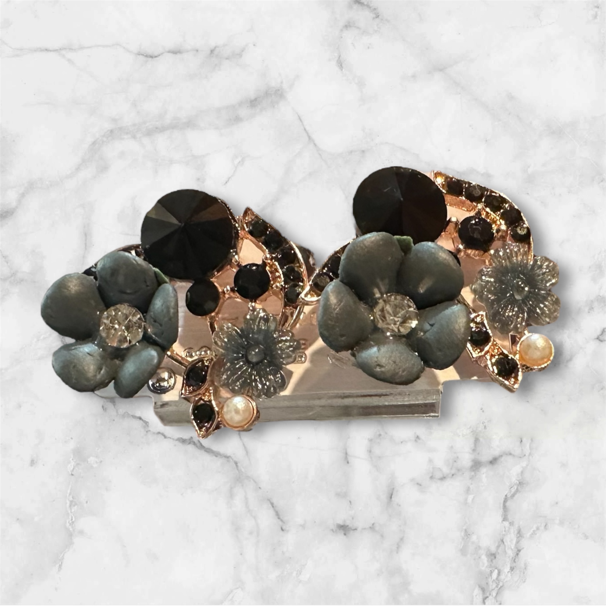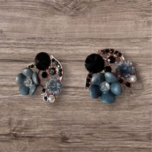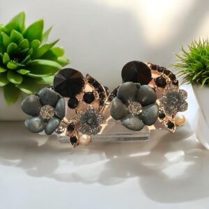 “Elegant floral stud earrings featuring sparkling black crystals and clear center stones. Perfect for adding glamour to any outfit, these statement studs offer a timeless, luxurious look. Ideal for weddings, parties, or everyday chic style.”