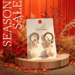 These elegant pearl drop earrings are the epitome of sophistication and charm, perfect for formal occasions or festive events. The design features a golden circular hoop embellished with sparkling rhinestones, creating a shimmering effect. At the center, a delicate crystal floral motif adds a touch of timeless beauty, while the large pearl drop enhances the earrings’ graceful appeal.